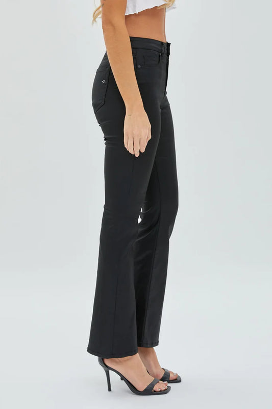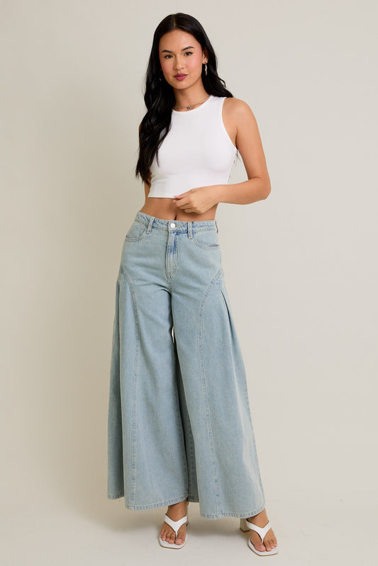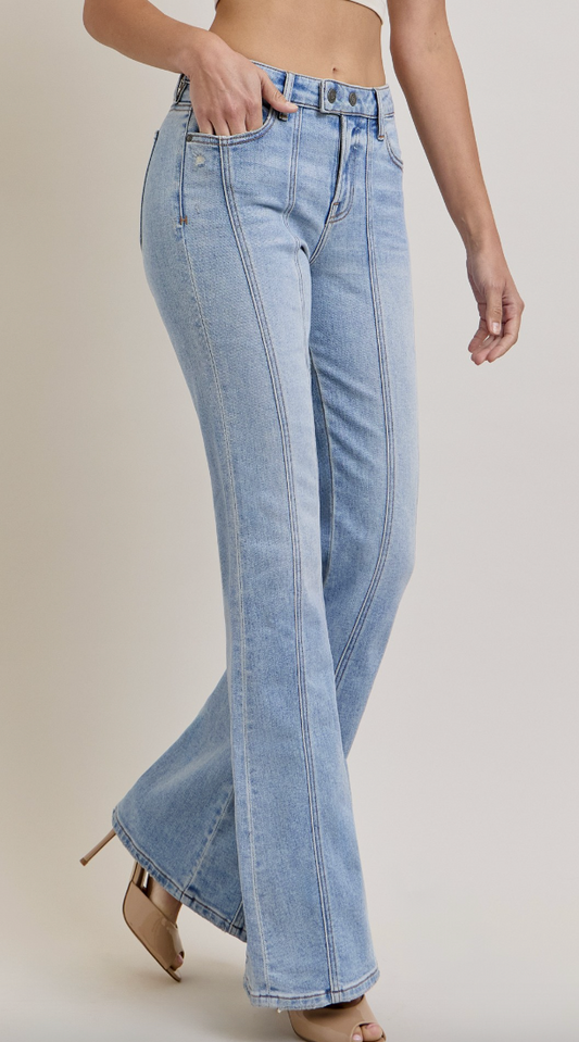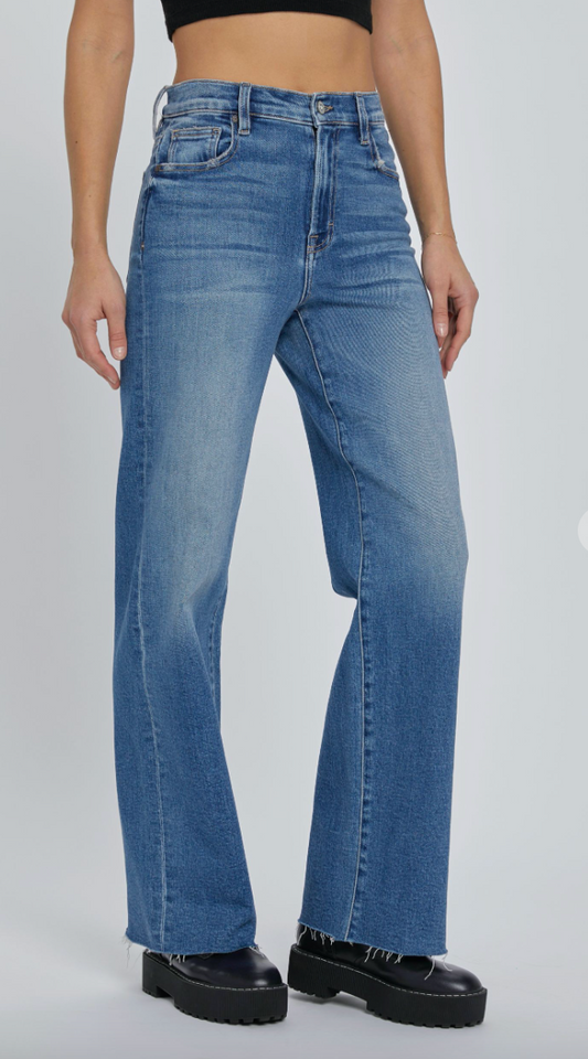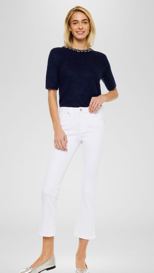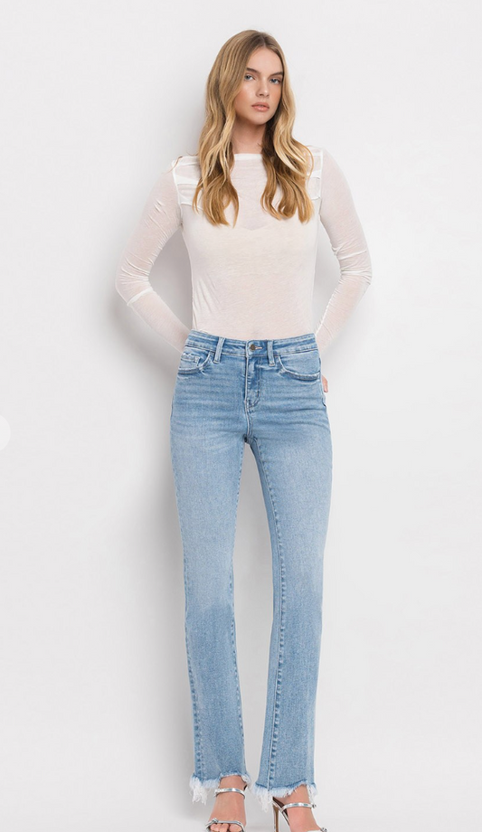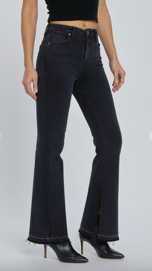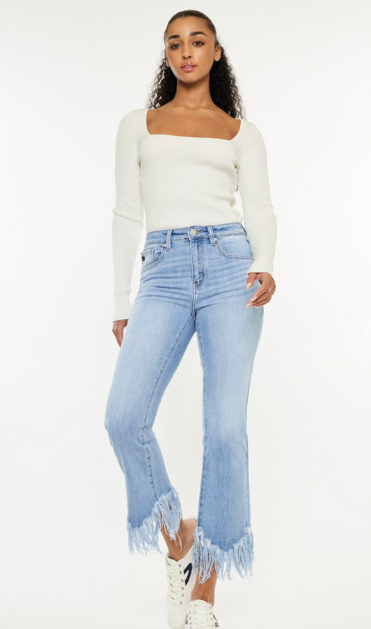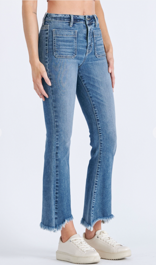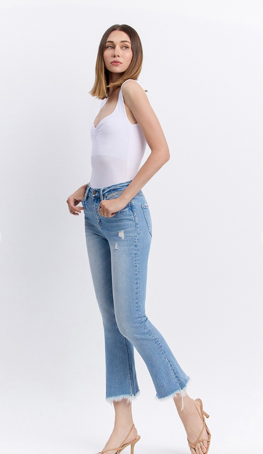 High Rise Raw Slant Step Hem Crop Flare Jeans